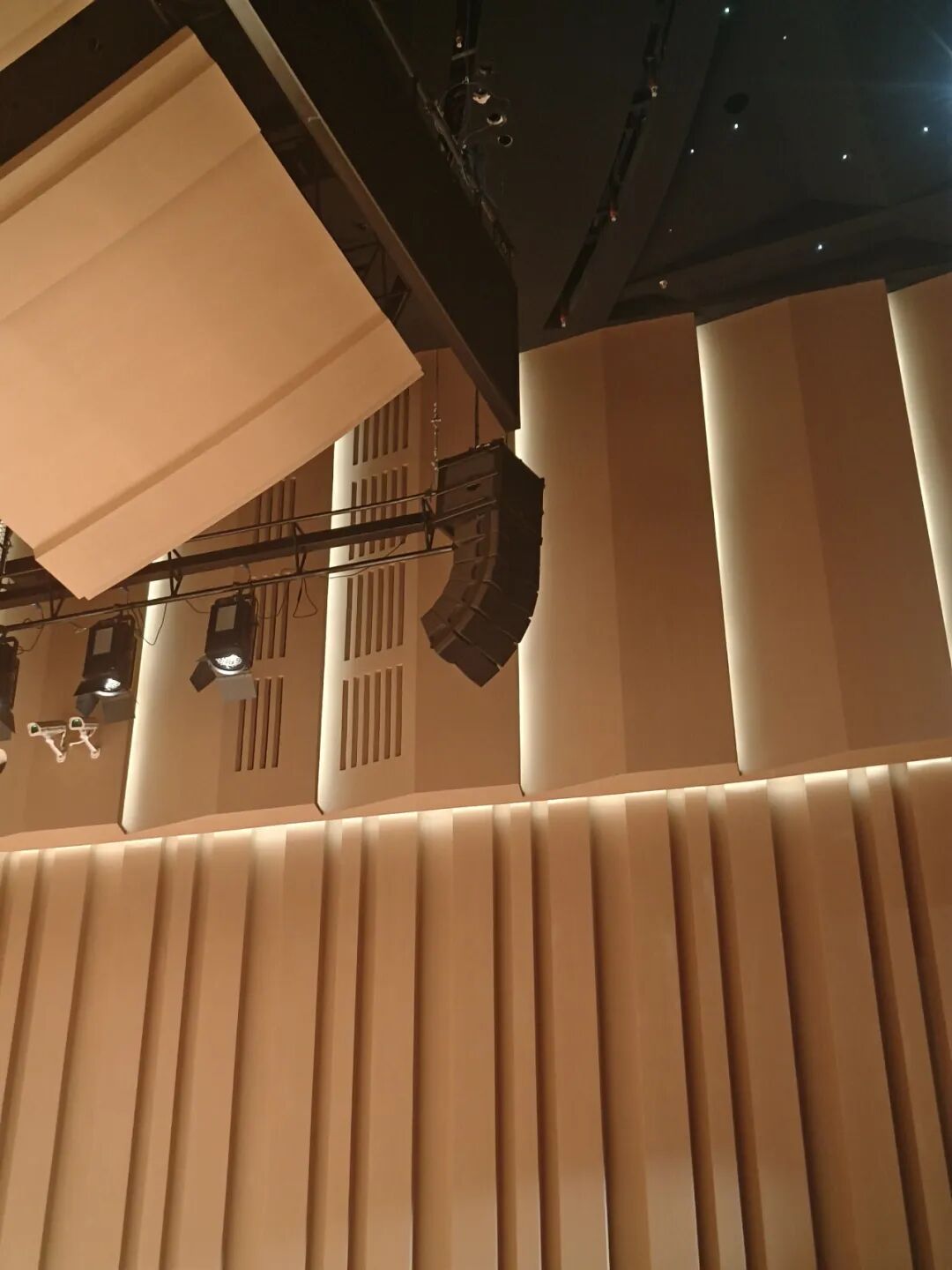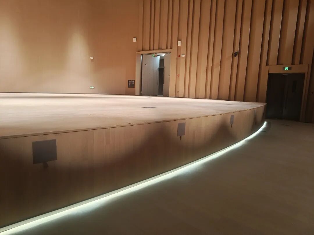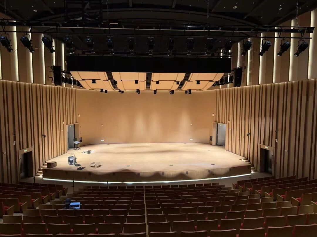 主扩由舞台两侧吊挂的Kiva II组成,黑色的箱体隐匿于黑暗中,与舞台融为一体。这种布局旨在为观众提供宽广而均匀的声音,同时还能不破坏建筑的设计风格。前补采用的是5XT。音乐厅的5XT同样采用嵌入舞台的形式,其主要负责填补近场声能,确保前排观众能获得细节清晰的听感。