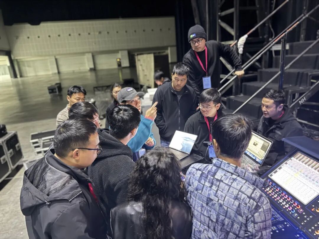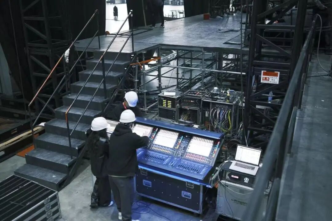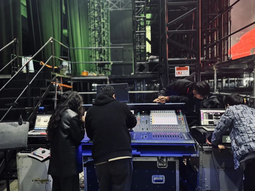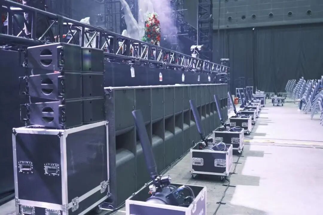 本次舞台为了呈现出更优的音质,团队综合多方面考量,精心部署L-Acoustics扬声器,每个扬声器的角度和高度都经过细心设计。团队在舞台左右吊挂了2串由14只K2组成的主扩扬声器线阵列,并在前方堆叠了KS28超低音扬声器,前区补声由Kara II负责,舞台返听则使用了12只X15 HiQ,以此实现全面且均衡的声学布局,确保现场音质清晰、纯净。