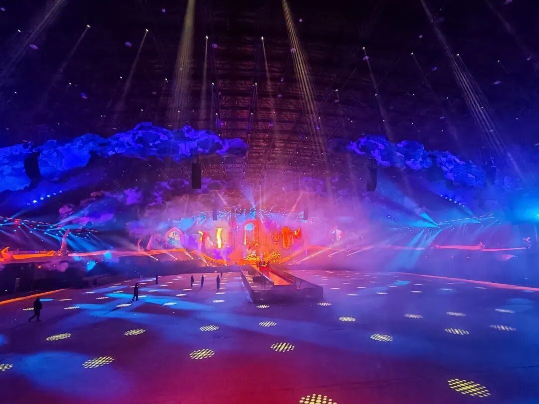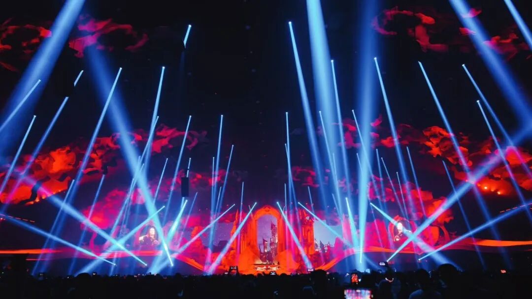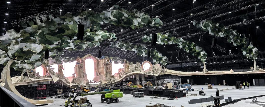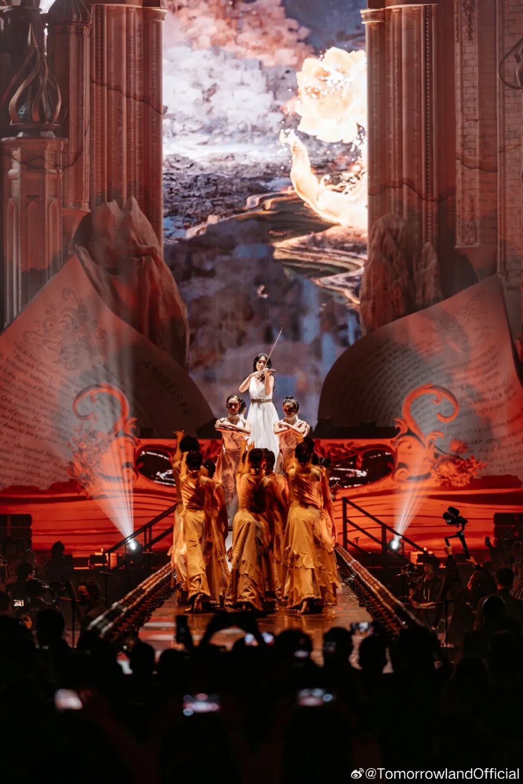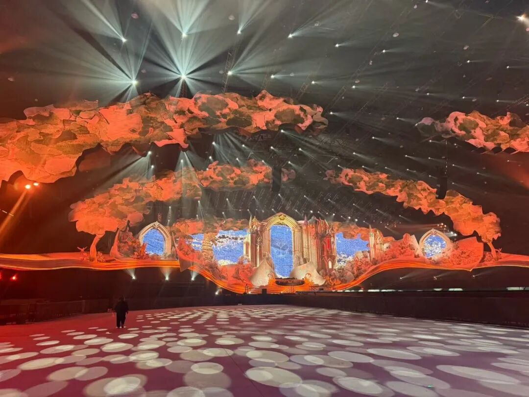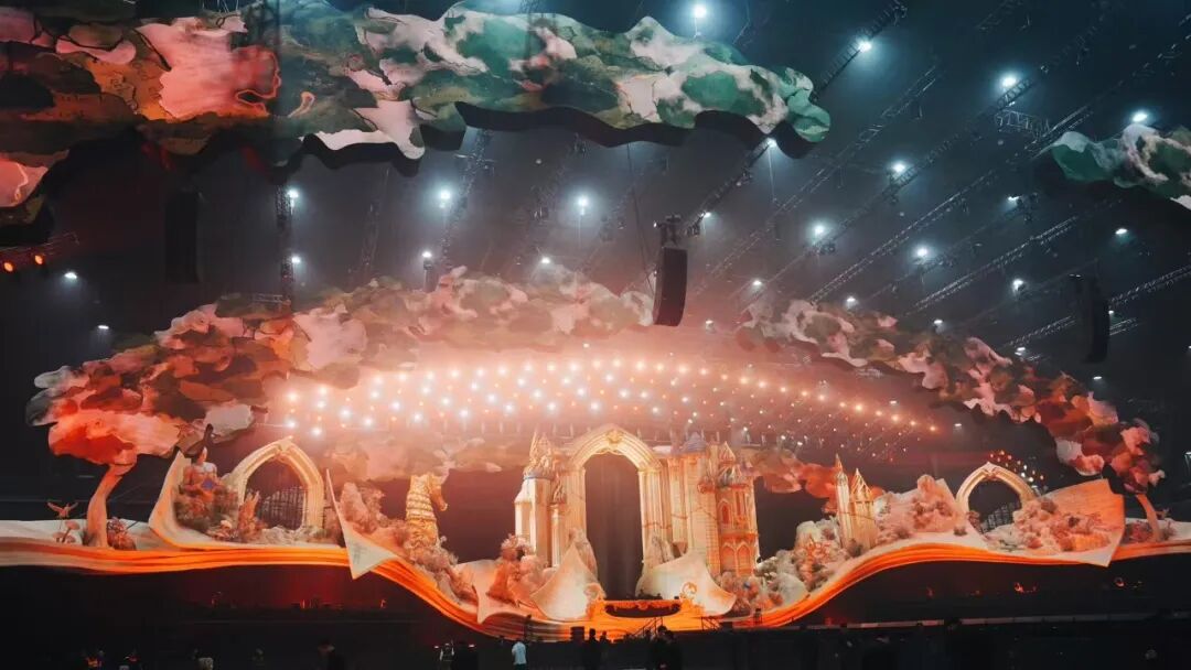 入门即可看到魔法时刻,全场以“纸上幻境”为主题,融合手绘东方纹样的45m舞台与374㎡巨型LED屏幕,塑造出东西方交融的视觉体验。恢弘盛大的视觉观感,让人瞬间沦陷。