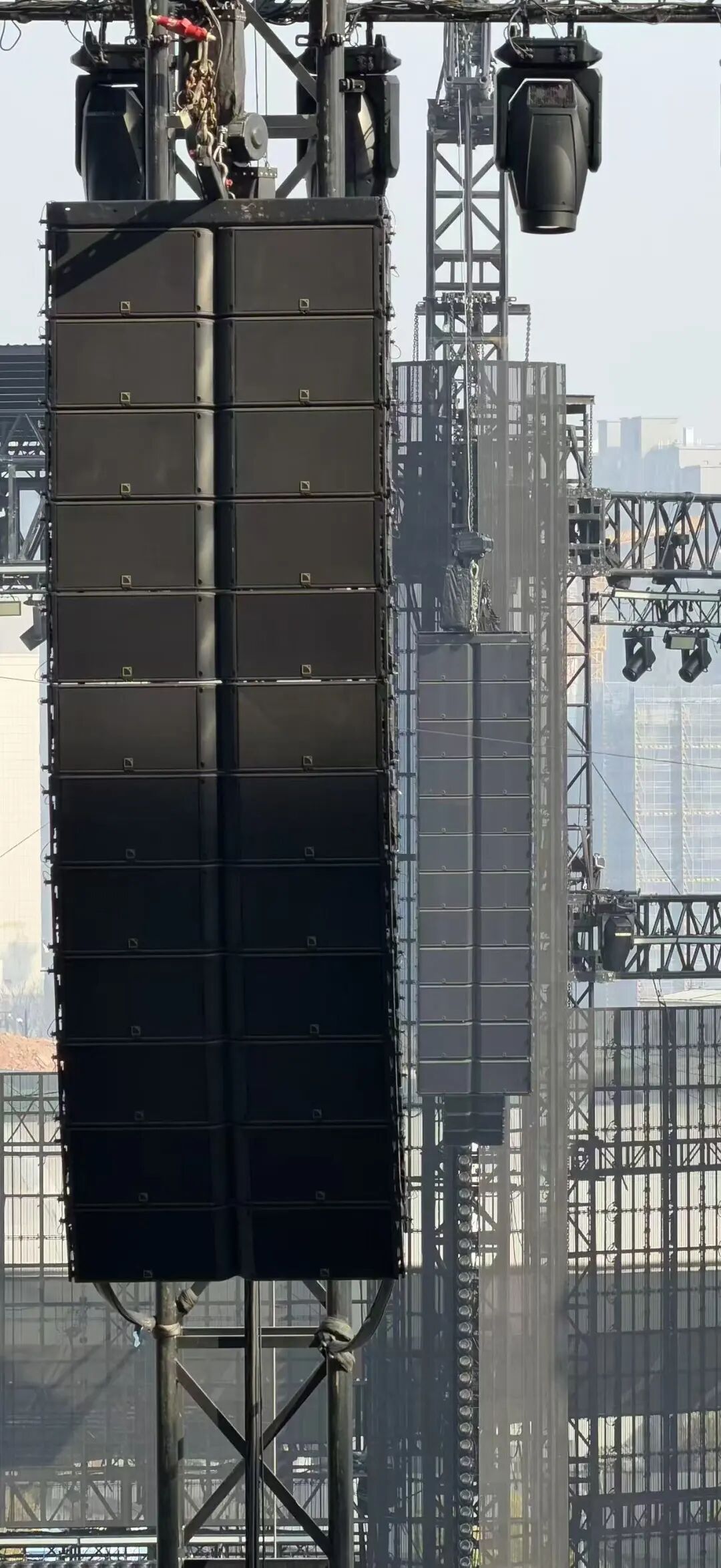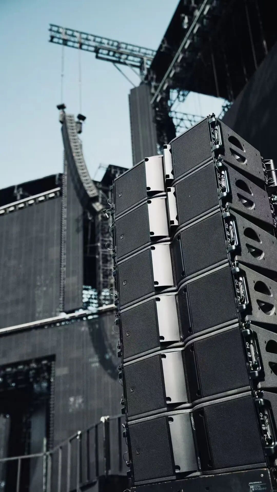 中心舞台左右两组主扩阵列,每组由12只L-Acoustics K1和3只Kara II组成。 K1作为L-Acoustics极具标志性的扬声器,以其强大的的声压级、极低的失真和卓越的指向控制能力,负责将能量十足的中高频信号清晰、稳定地投射到远场观众区,是大型场馆演出的“尖子生”。而阵列底部搭配的3只Kara II,则扮演着关键的“衔接”角色。