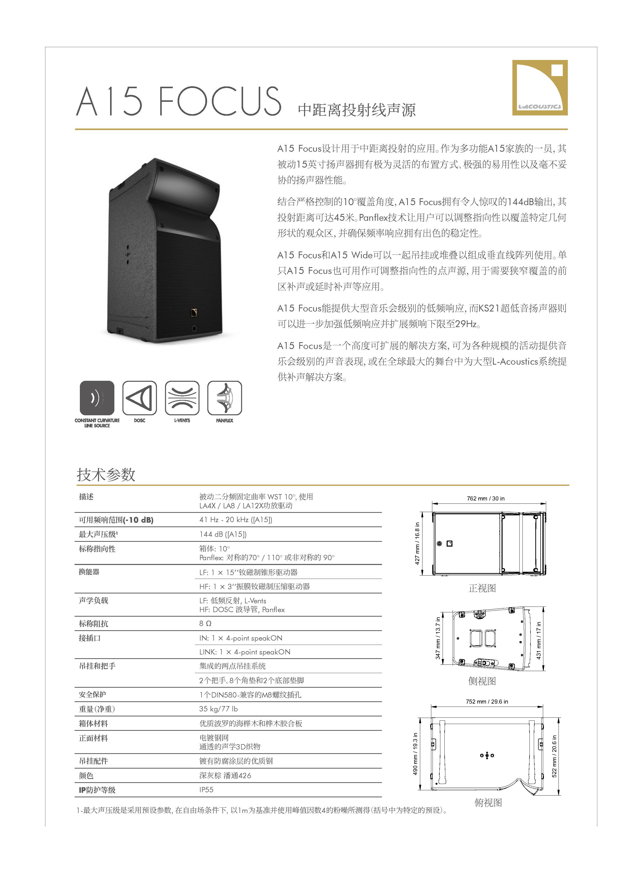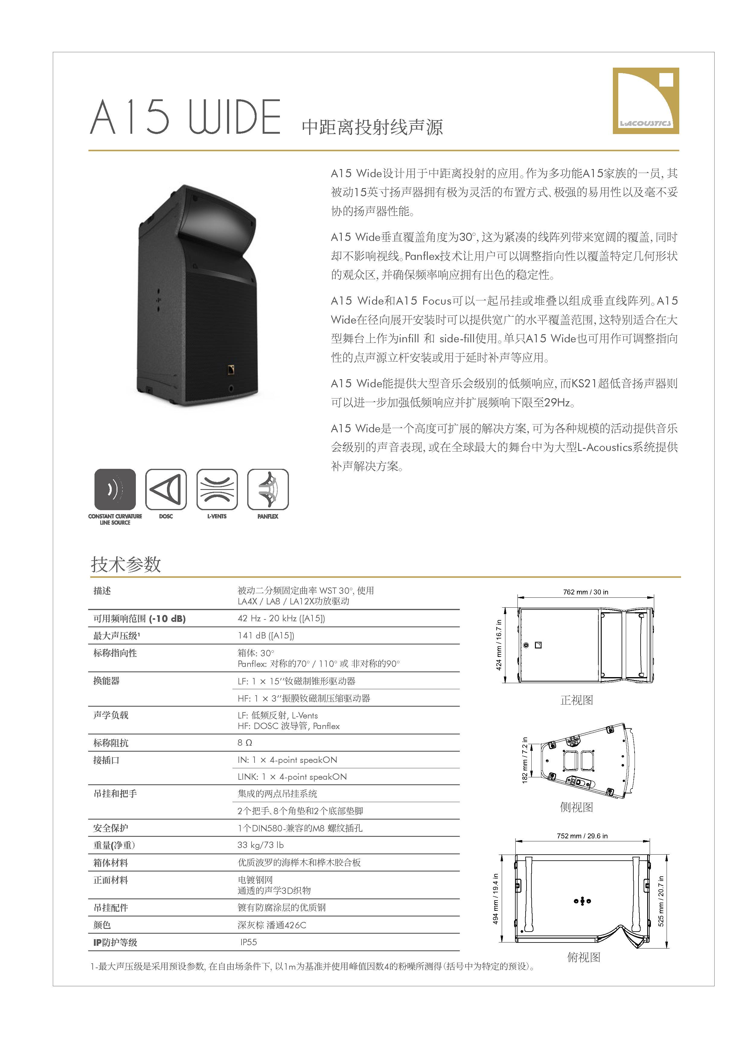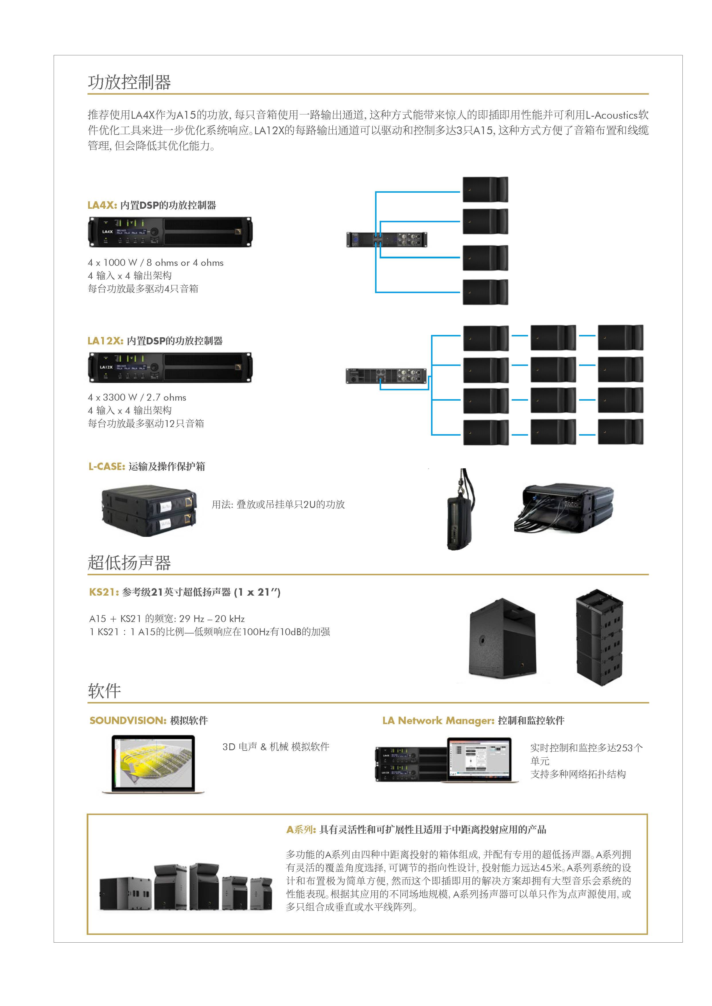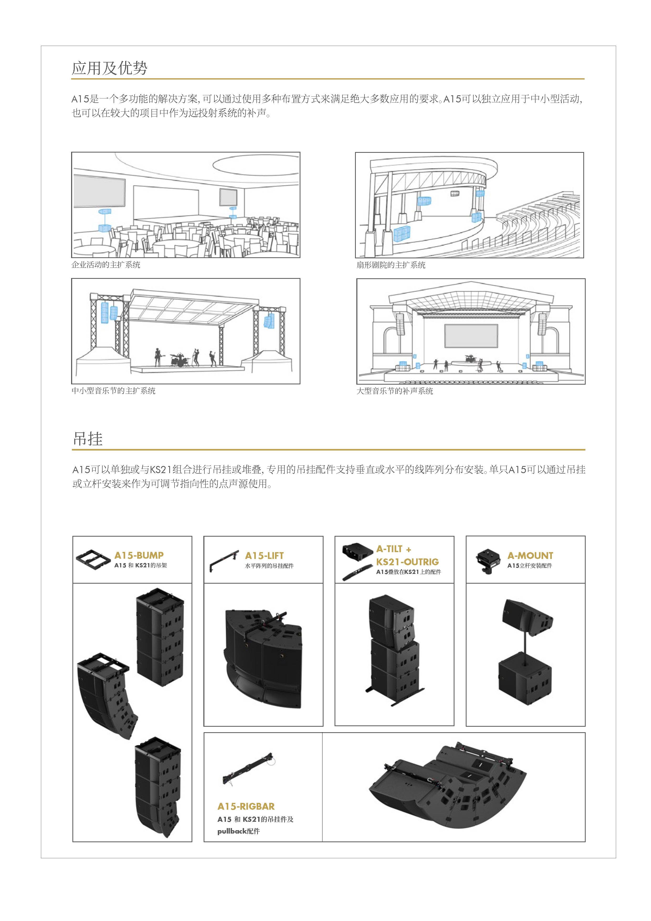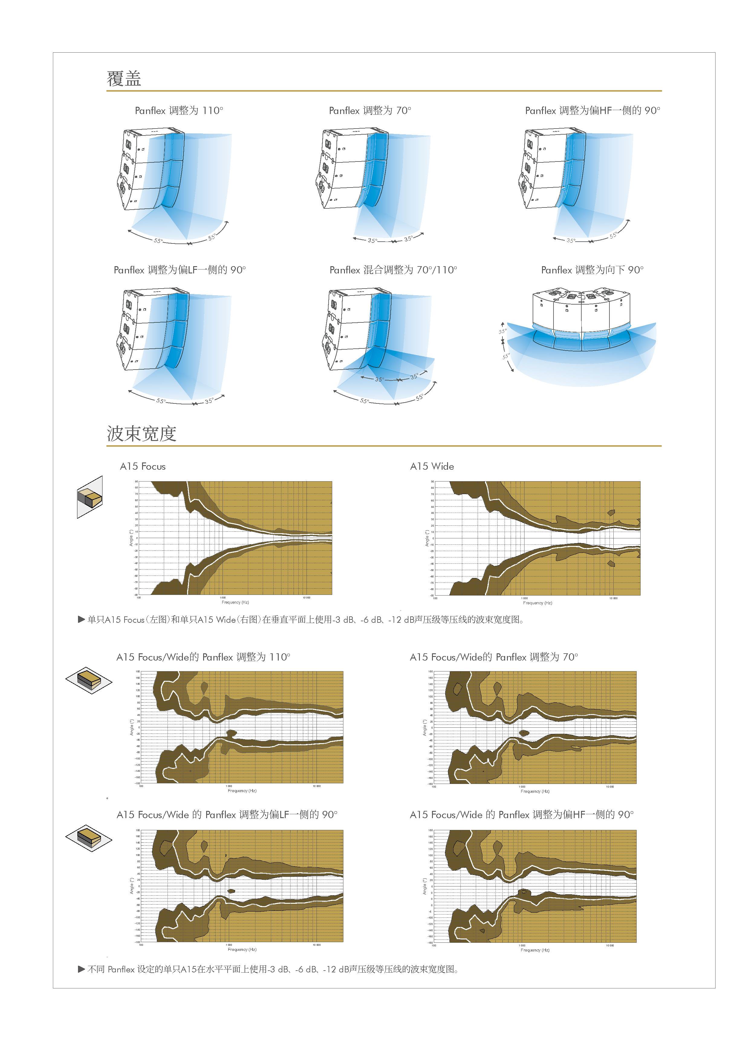 A15拥有两种不同覆盖的箱体(10°或30°),箱体上带有用户可调整的波导 指向性Panflex (70°、110°或不对称的90°)以及一系列用于垂直或水平安装的配件。