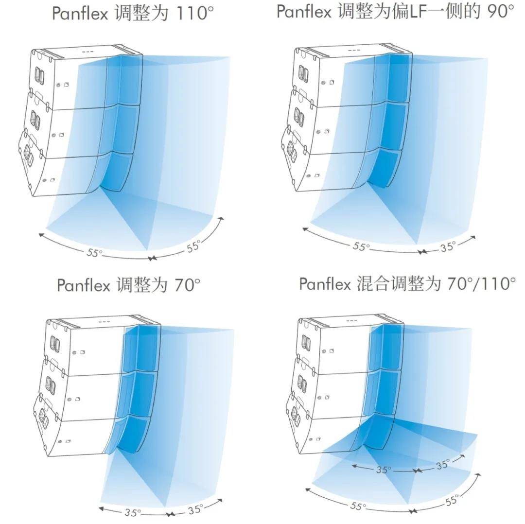 中置部分选用的是A15固定曲率扬声器,垂直的线阵列组合吊挂于舞台中间。A15拥有Focus和Wide两个版本,分别具有10°和30°的指向性。另外,在安装吊挂前,每只音箱可按照需求通过物理方式调整成三种不同辐射角度,组合并吊挂安装,如图所示: