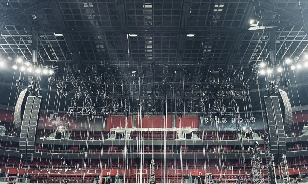 此次「狂爱」巡回演唱会·重庆站的主扩线阵列扬声器由来自L-Acoustics的K2(*15)&Kara II(*3)组成,在舞台两侧各吊挂了一串。而主扩两侧的侧面补声线阵列扬声器则各由12只K2组成。