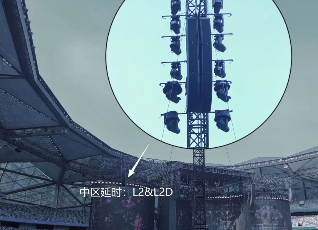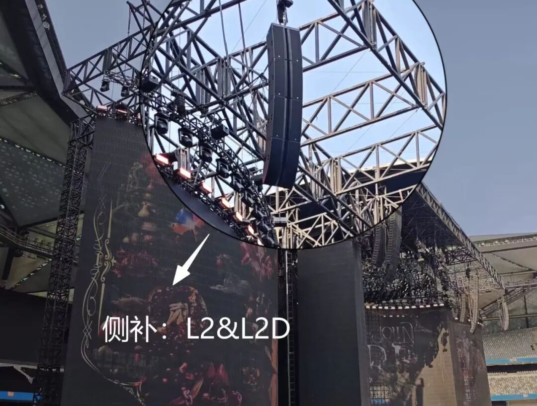 为了进一步补充两侧及远处的声场覆盖,团队还采用L-Acoustics的L系列部署侧补(单组:3只L2+1只L2D)与延时塔(单组中区延时:2只L2+1只L2D;单组后区延时:1只L2+1只L2D)。L2作为渐进式高密度线声源扬声器,能够提供高达155dB的声压级与宽广的覆盖。L2D与其搭配使用,则进一步保证了补声的全频段表现。